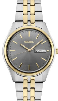 Quick Shop Seiko Gents Seiko crafted of stainless steel in versatile two-tone finish, this perfectly balanced watch features a Gray sunray dial with day/date calendar and sleek gold stick markers for a superb blend of clarity and style. 10 bar, 100M Water Resistant $225.00