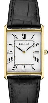 Quick Shop Seiko Gents Seiko crafted of stainless steel in gold-tone finish, this elegant watch, with sophisticated rectangular case, features a traditional white dial with Roman numerals and finely shaped hands, cabochon crown and black leather strap $225.00
