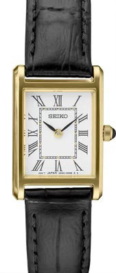 Quick Shop Seiko Ladies Seiko Crafted of stainless steel in gold-tone finish, this elegant watch, with sophisticated rectangular case, features a traditional white dial with Roman numerals and finely shaped hands, cabochon crown and black leather strap $225.00