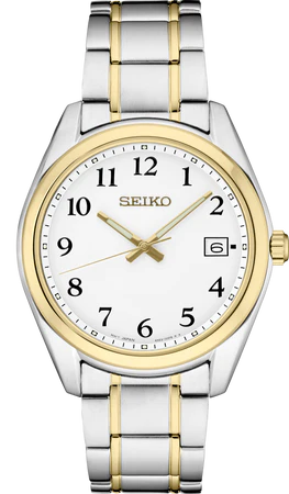 Quick Shop Seiko Gents Seiko with bold Arabic numerals on a pure white dial with gold accents, this versatile design features a date calendar and LumiBrite hands. Crafted of stainless steel with two-tone finish and scratch-resistant sapphire crystal. $315.00